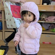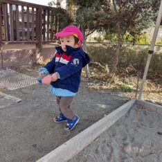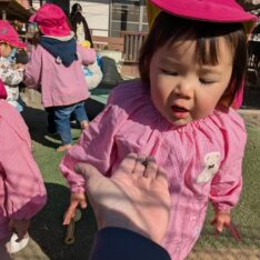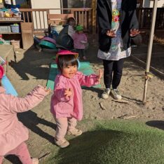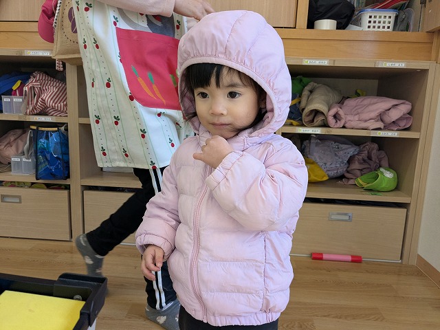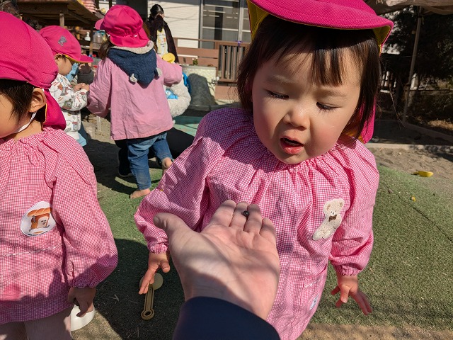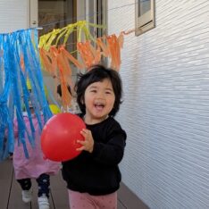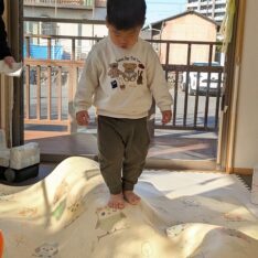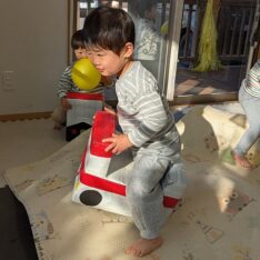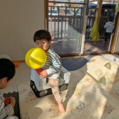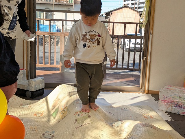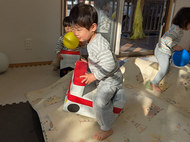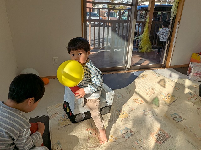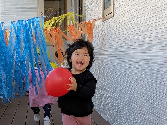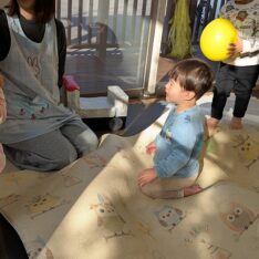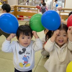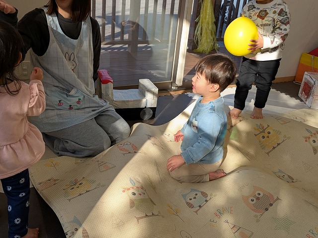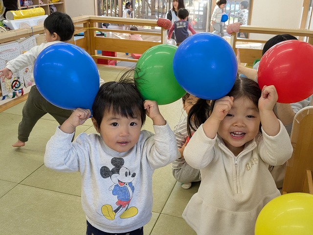 今日は、室内でクレヨンやシールで遊んだり、風船を飛ばしたりして楽しんでいました。でこぼこマットを渡ったり、園庭でダンゴムシを見つけたりとして楽しむ姿もありました。