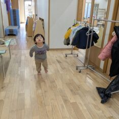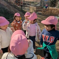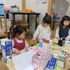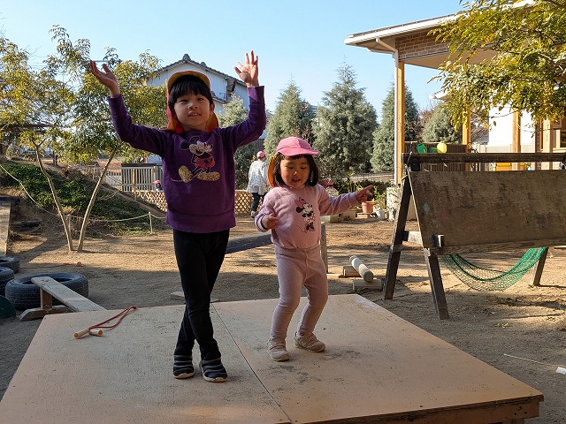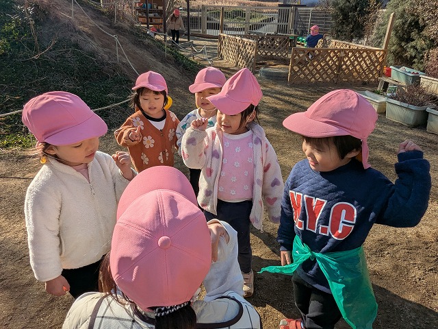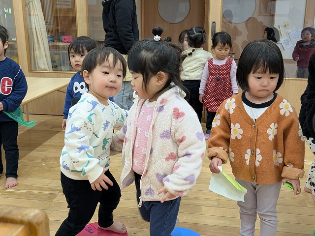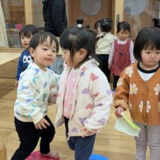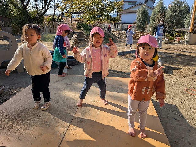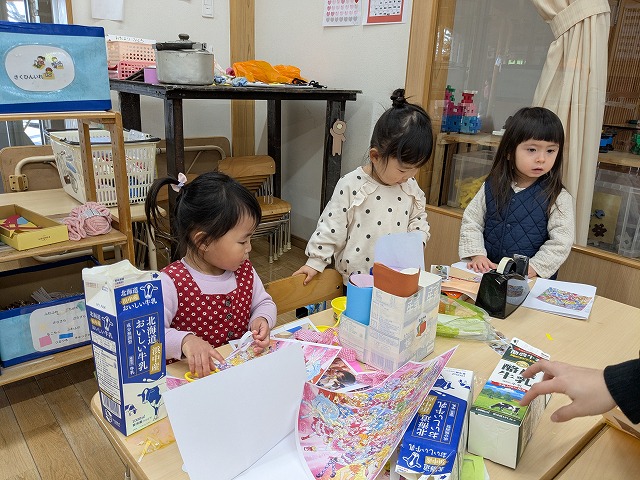 今日は、園庭で曲に合わせてダンスを踊ることを楽しんだり、むっくりくまさんをして身体を動かしたりすることを楽しむ姿がありました。室内では、ハサミやノリを使って制作をしたり、おままごとをしたりすることを楽しむ姿がありました。