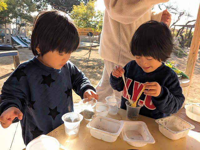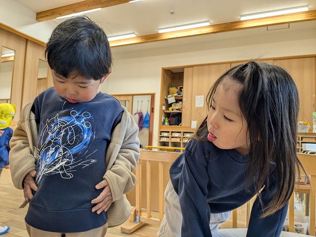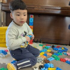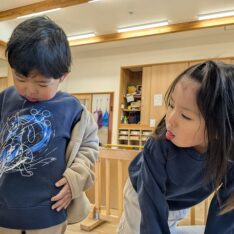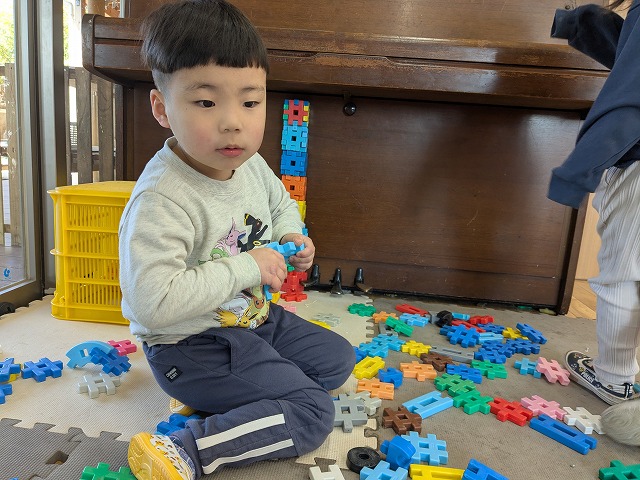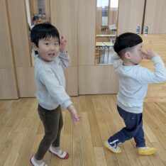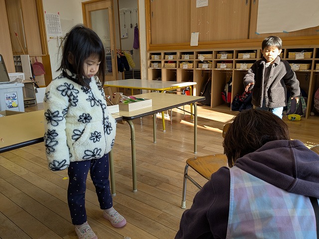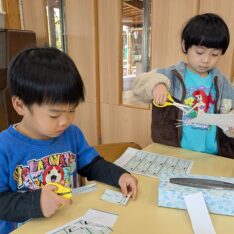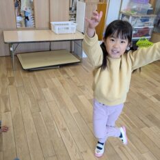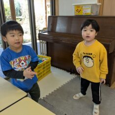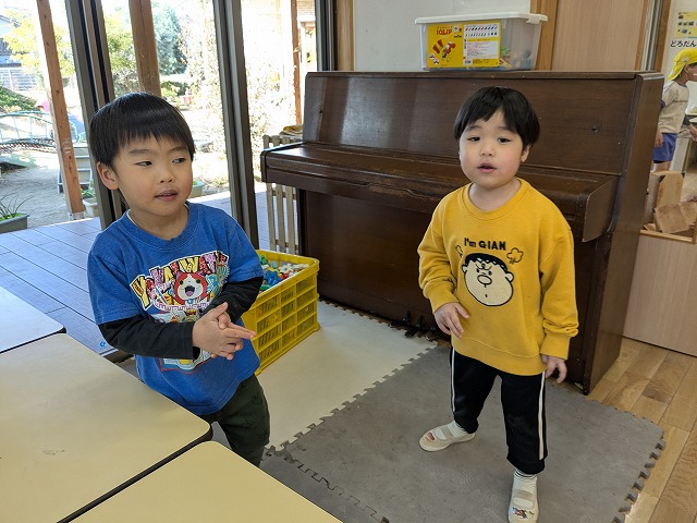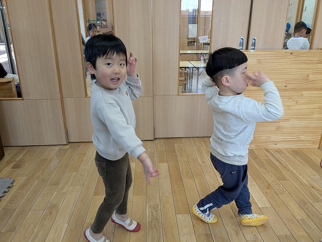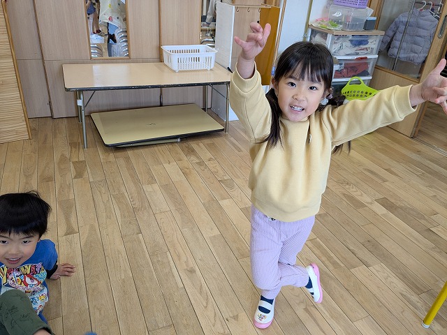 今日は、歌を聞きながら、体を動かして遊びました。好きな曲をお友だちと楽しく踊っていましたよ。また、お部屋では、画用紙を切ったり、丸めたりしてお弁当を作って遊んでいました。