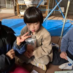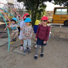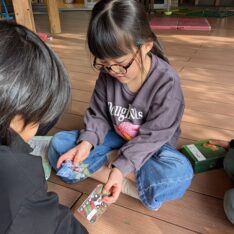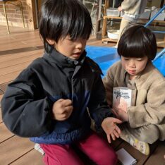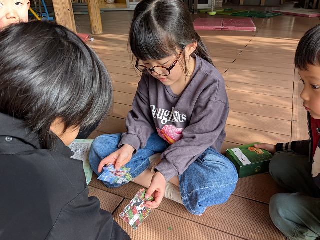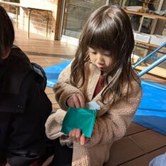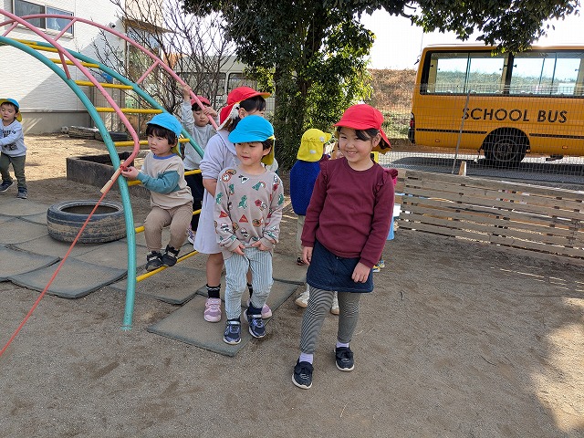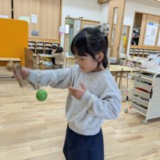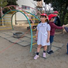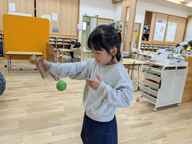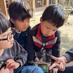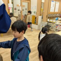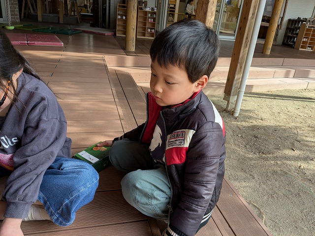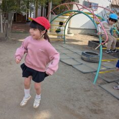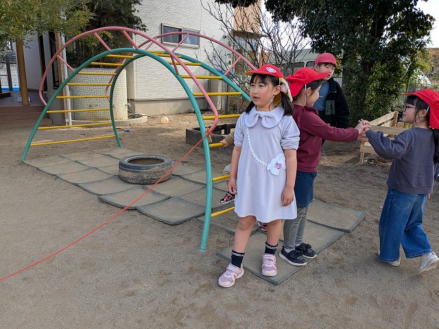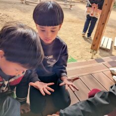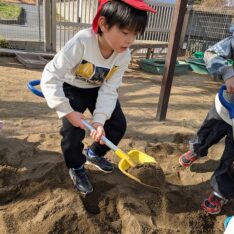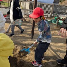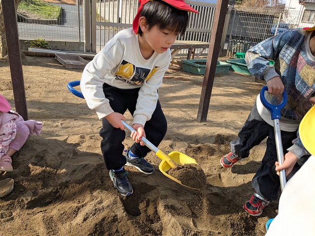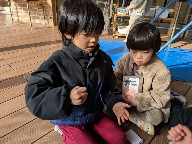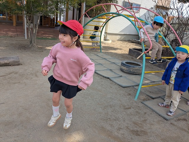 園庭では、縄跳びやダンスなどをしました。縄跳びでは、保育者に縄を回してもらって長縄を楽しむ姿も見られました。また、赤土や水を使って泥団子をつくりました。「ヒビができたら水をつけるんで」と知っていることを教えたりする様子も見られました。つくった泥団子を大事に隠しておく姿も見られました。