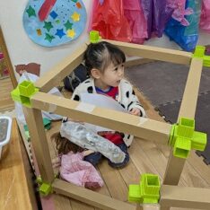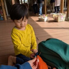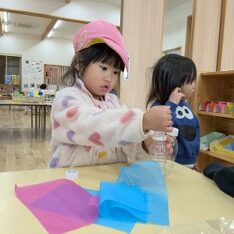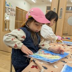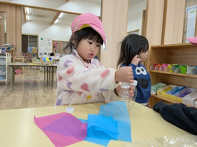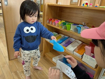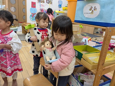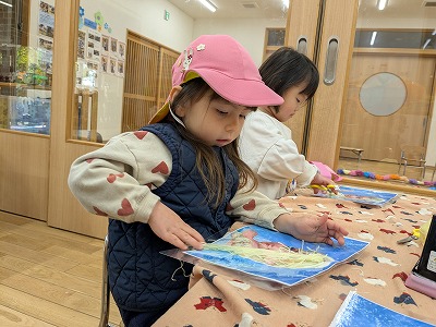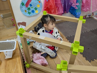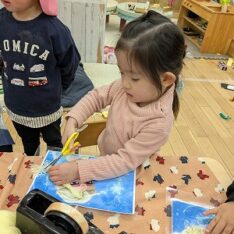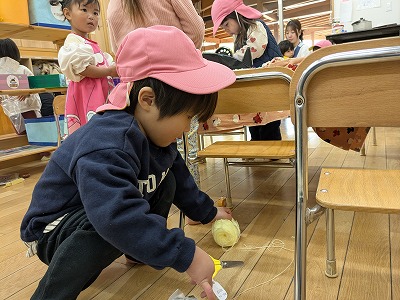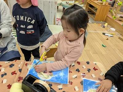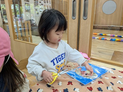 園庭ではおままごとをして遊びました。お部屋ではプリンセスのコピーしたものに毛糸で髪の毛をつけたり、つけた髪をハサミでカットして遊びました。