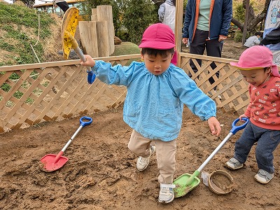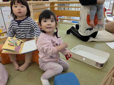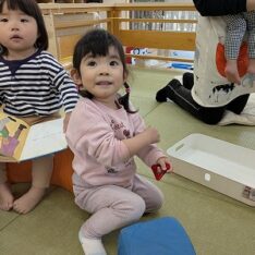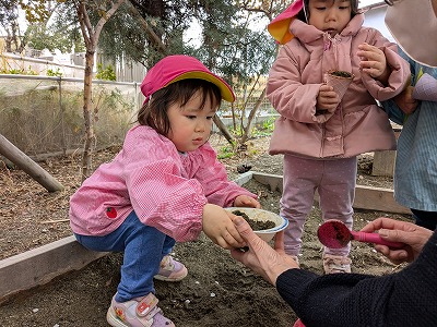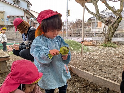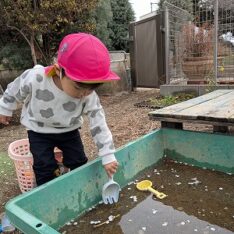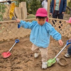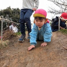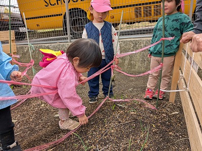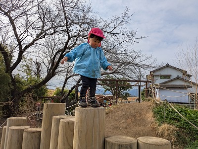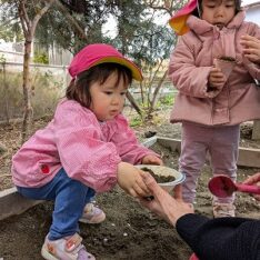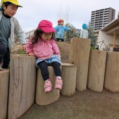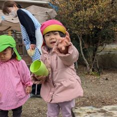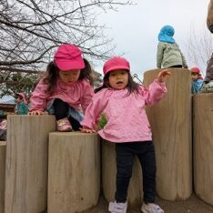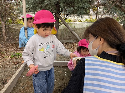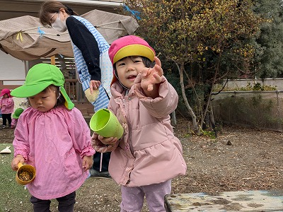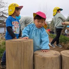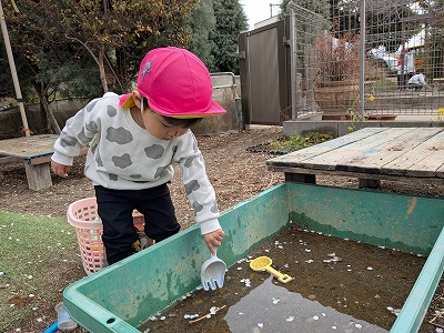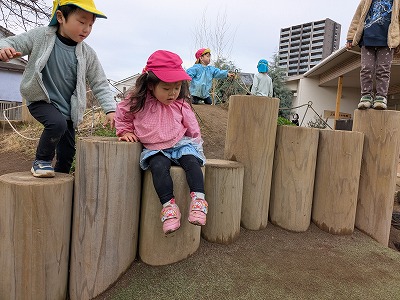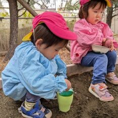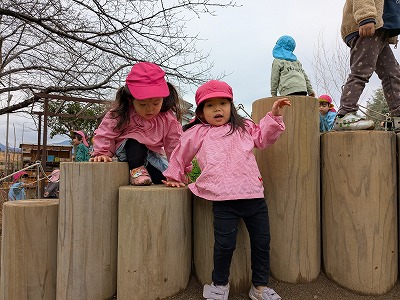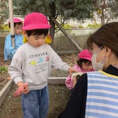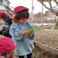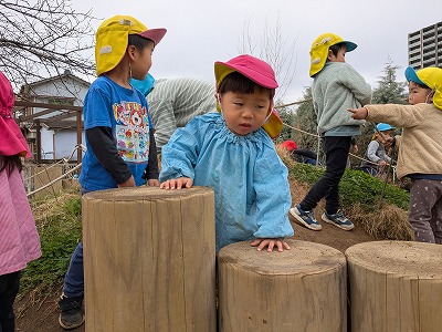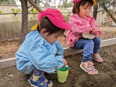 大きな園庭に遊びに行きました。丸太や築山の一本橋に挑戦したり、泥んこ遊びを楽しみました。小さい園庭では梅の花びらを拾い集めたり、タライに溜まった雨水を触って遊びました。