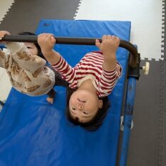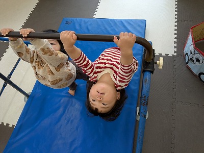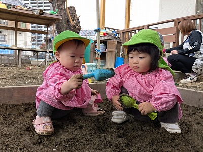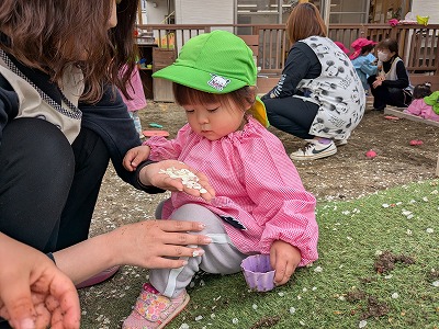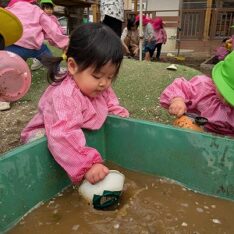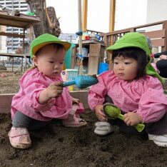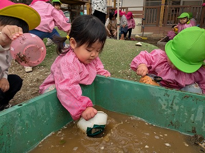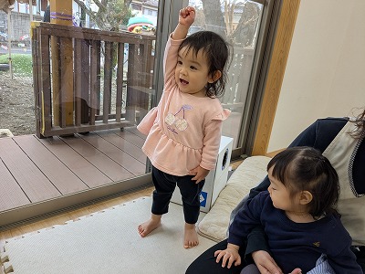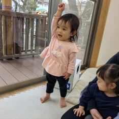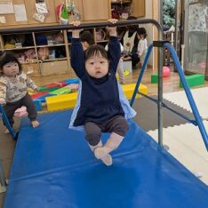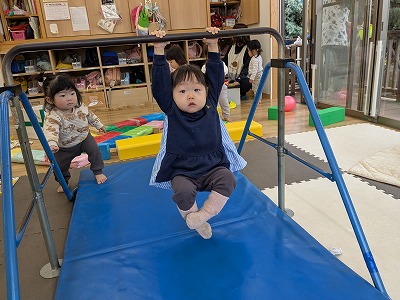 室内では、保育者と一緒にダンスを踊ったり鉄棒にぶら下がったりして体を動かして遊んでいます。園庭では、梅の花びらや砂などの自然に触れています。