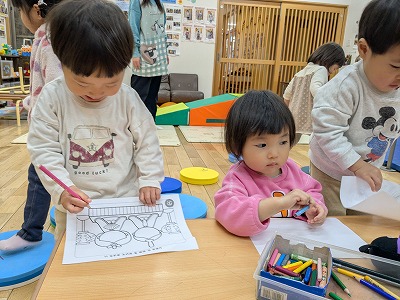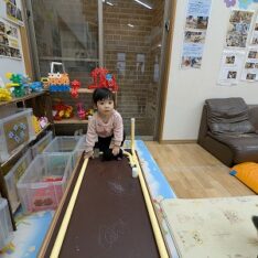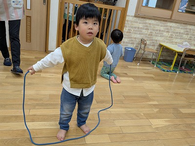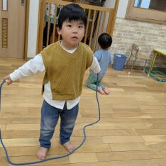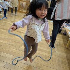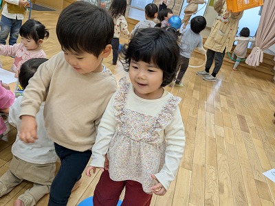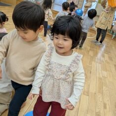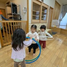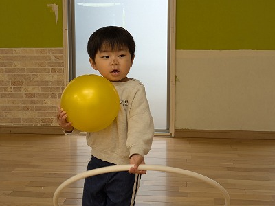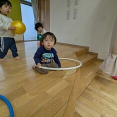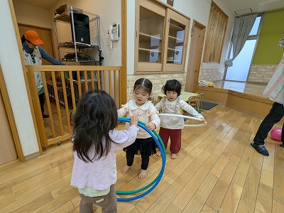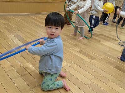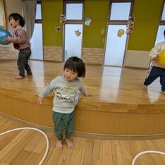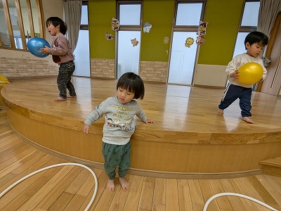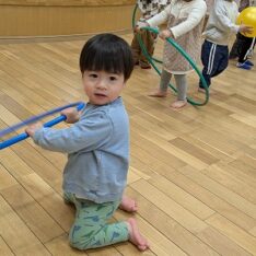 今日は、ホールで遊びました。ボールを投げたり、フラフープを電車のようにして歩いたり、鉄棒にぶら下がったりして楽しんでいました。