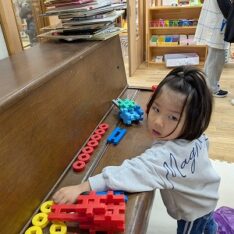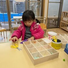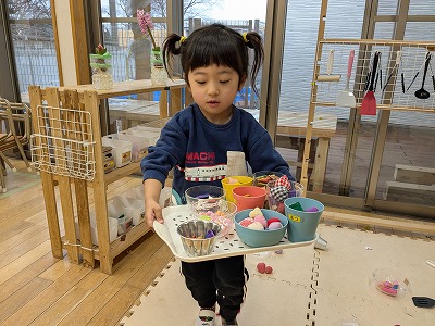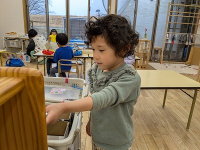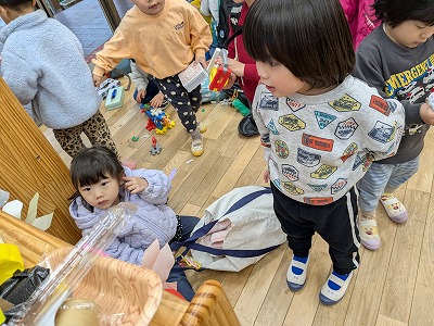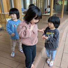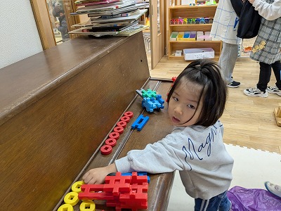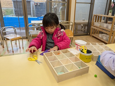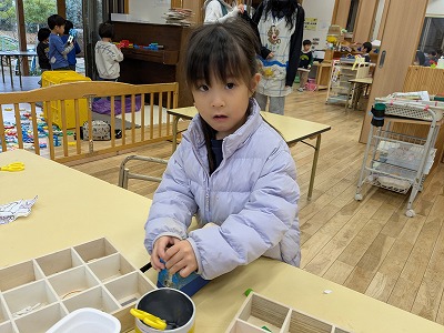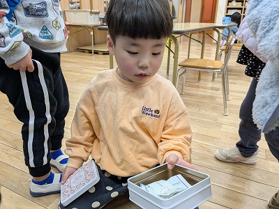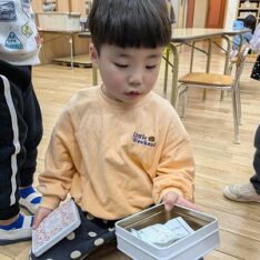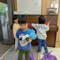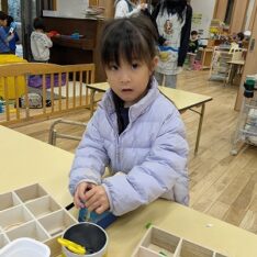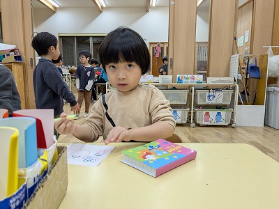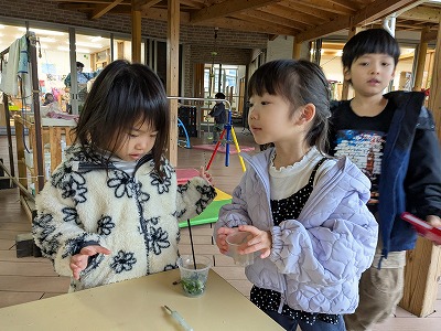 今日は、滲み絵をして遊びました。スポイトでポトポトと水を垂らすと、ひとつずつ滲み、昨日とは違う滲み方を楽しんでいました。