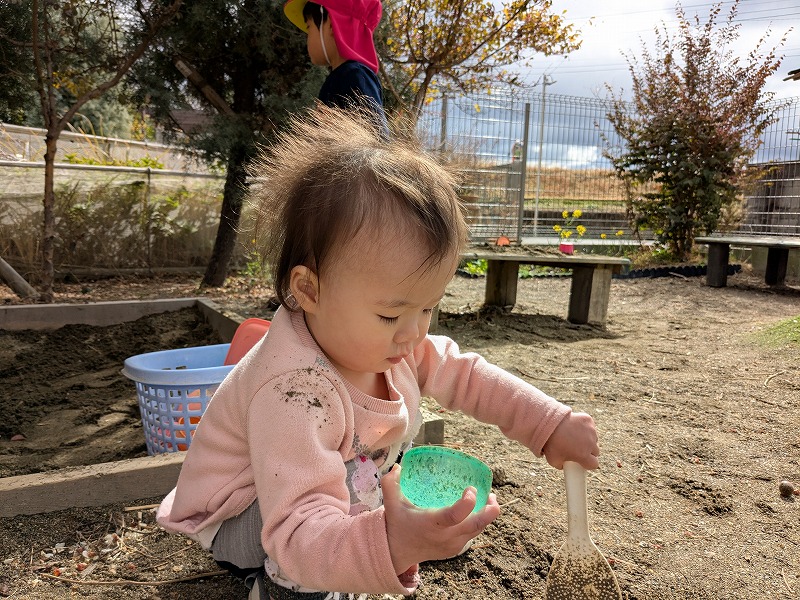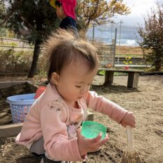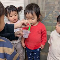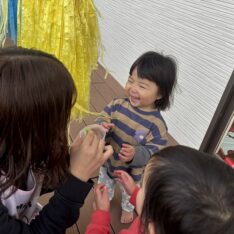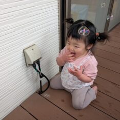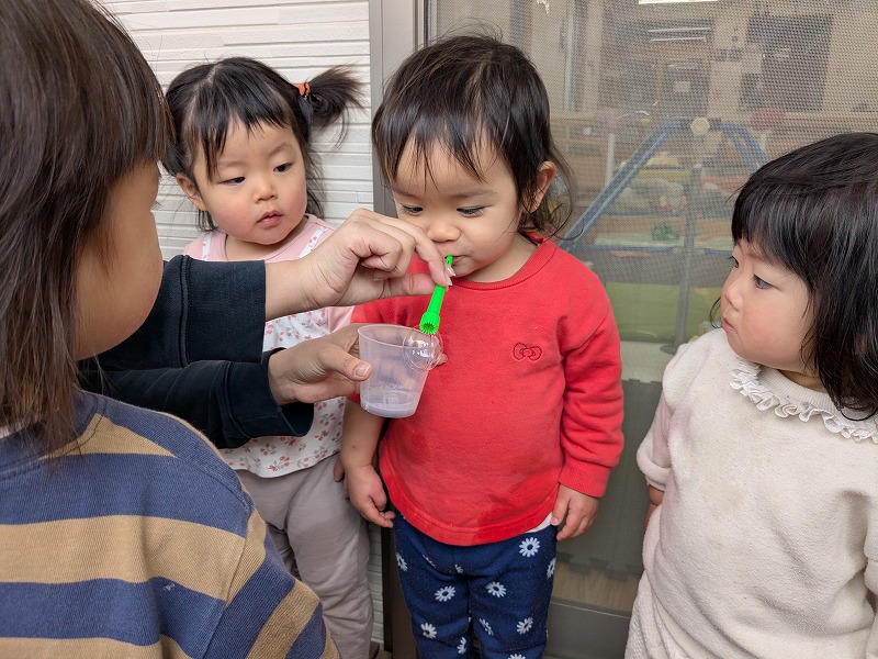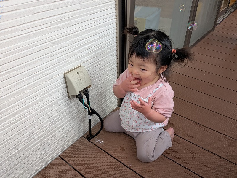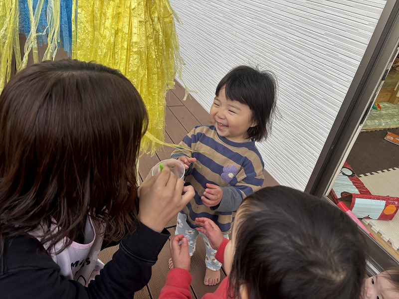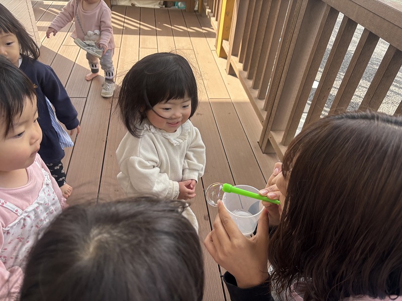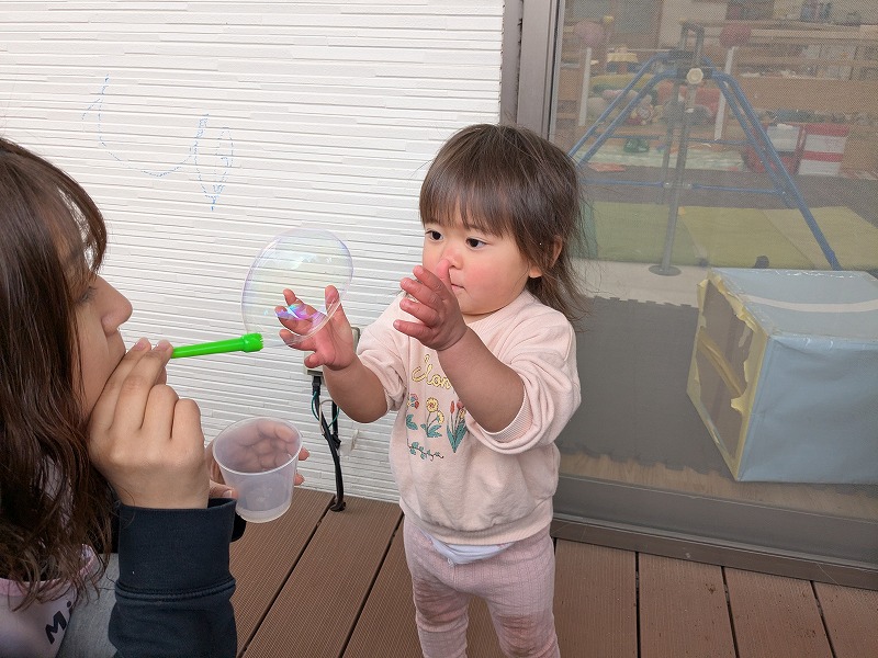 室内では、鉄棒や平均台を使って体を動かして遊んだり、保育者と一緒にダンスをして楽しんでいます。テラスでは、追いかけっこをして遊んだり、シャボン玉を見て手を伸ばしたり「わぁ〜!」と言って楽しんでいました。