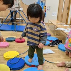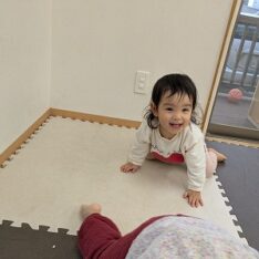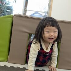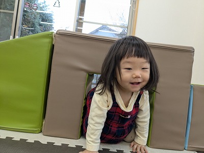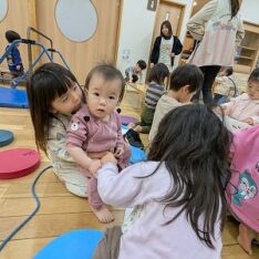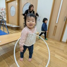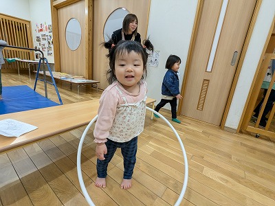 ホールに行って体を動かして遊びました。ボールを投げたりフラフープの中をくぐったりして楽しんでいます。また、お兄ちゃんお姉ちゃんと手を繋いで歩いたり、後をおったりして関わろうとする姿がありました。